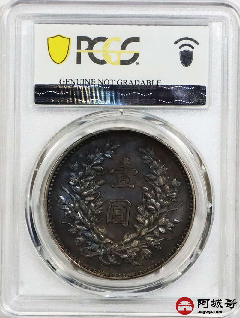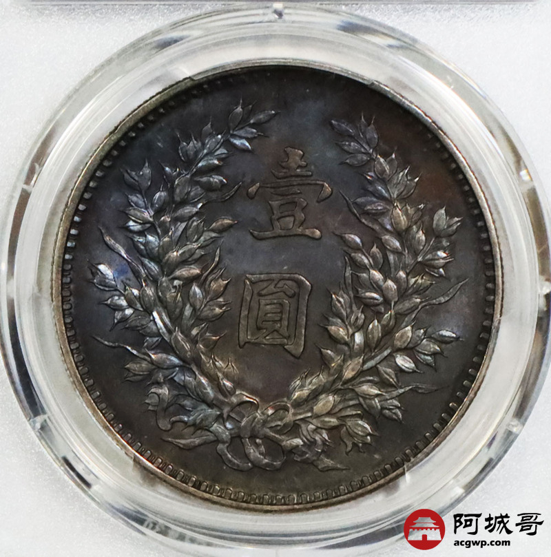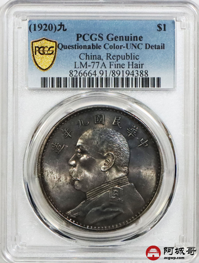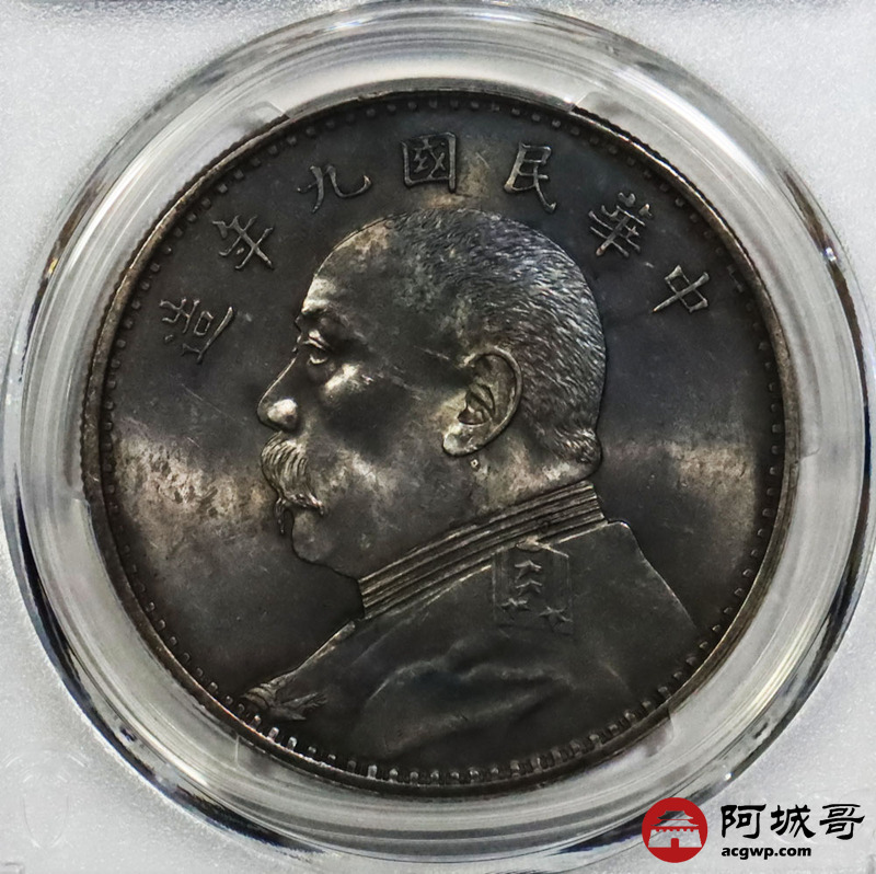 Lot:1864 1920民国九年大头袁世凯像壹圆银币一枚,精发版,底板氧化黑彩 PCGS UNC91评级编号:89194388