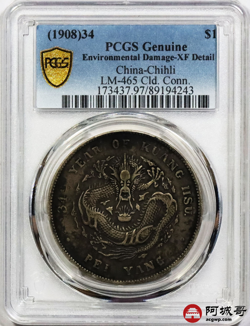 Lot:1761 1908光绪三十四年北洋造光绪元宝库平七钱二分银币一枚,酱彩老味道 PCGS XF97评级编号:89194243