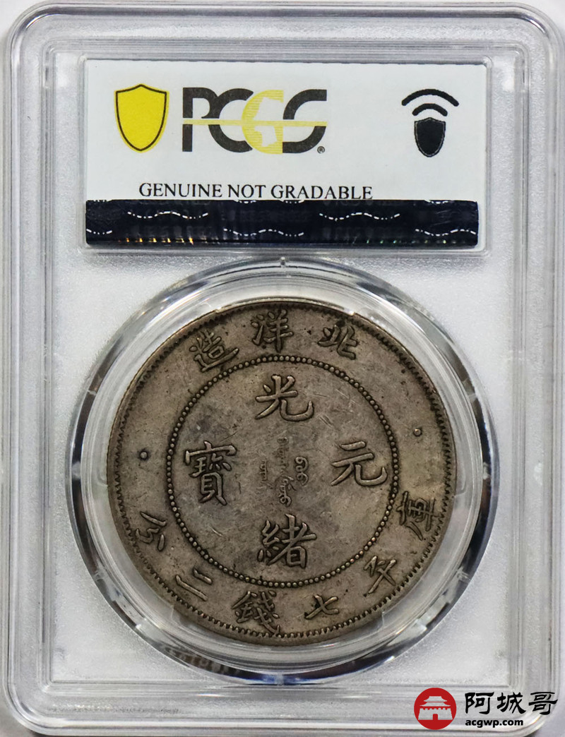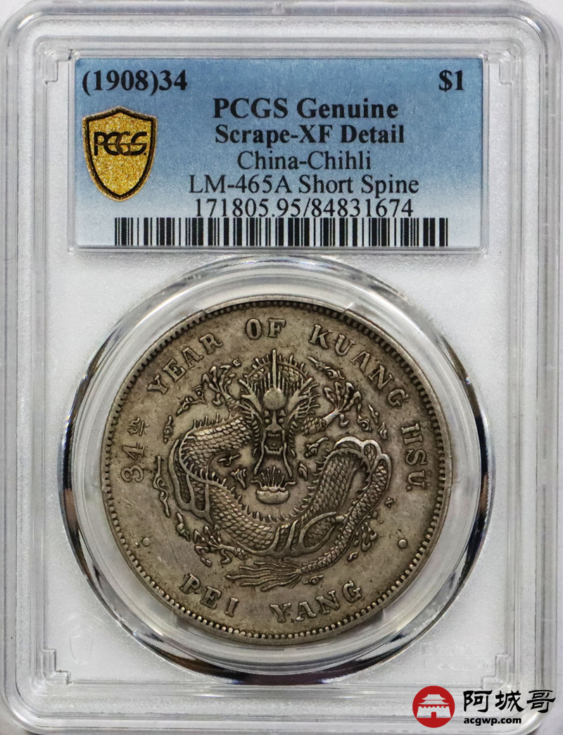 Lot:1621 1908光绪三十四年北洋造光绪元宝库平七钱二分银币一枚,短尾龙,原味 PCGS XF95评级编号:84831674