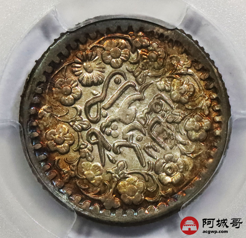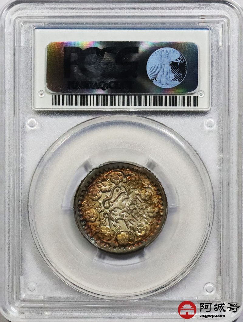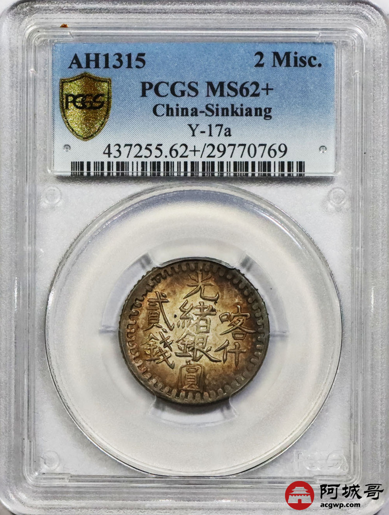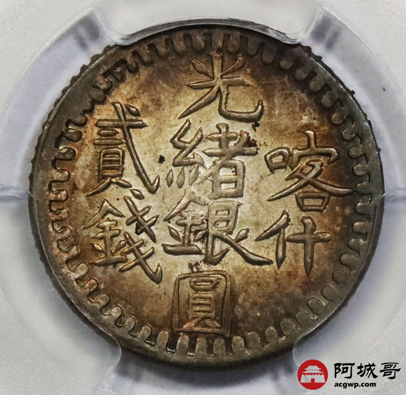 Lot:1441 AH1315喀什光绪银元贰钱银币一枚,双面氧化五彩,色泽充沛,高分属实难得 PCGS MS62+评级编号:29770769