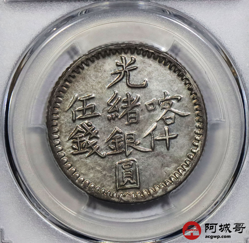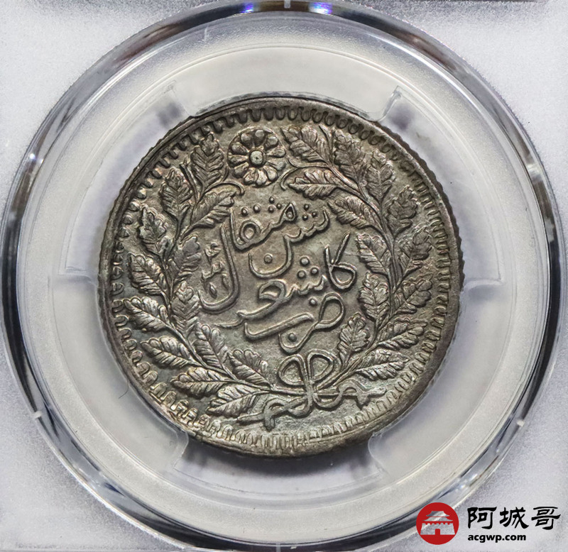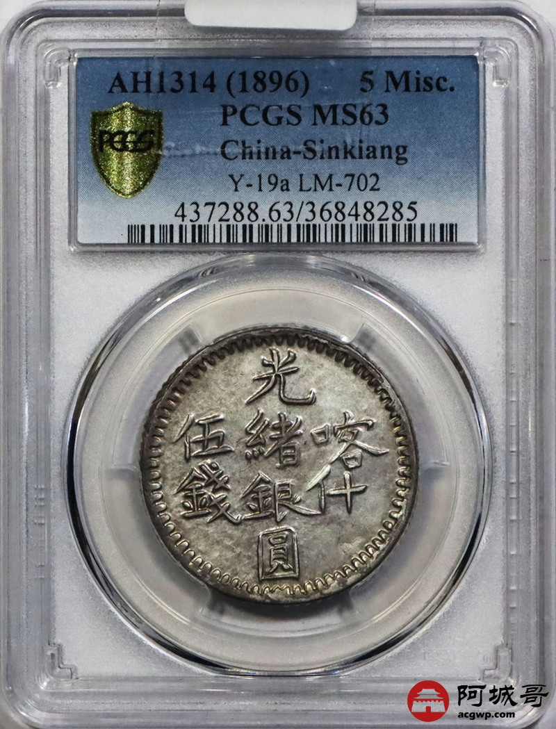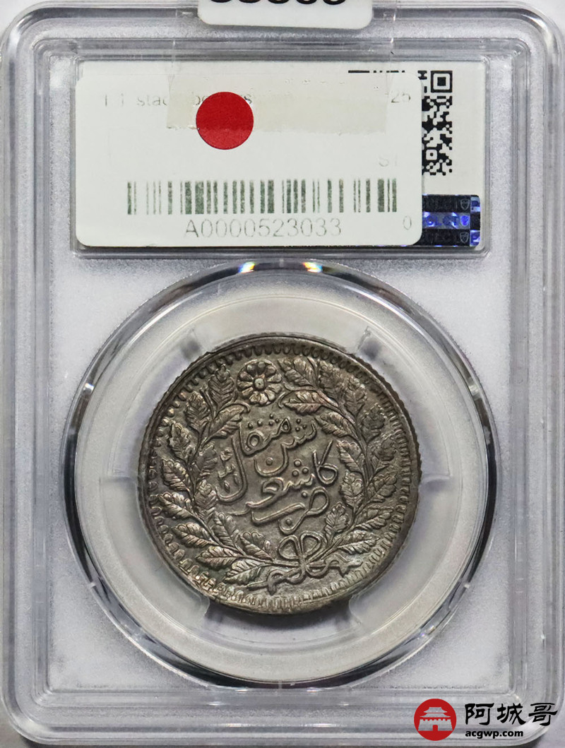 Lot:1443 AH1314(1896)年喀什造光绪银元伍钱银币一枚,原光全马齿,字口深打 该品种多为铸造缺陷,有此品相属实不易 PCGS MS63评级编号:36848285