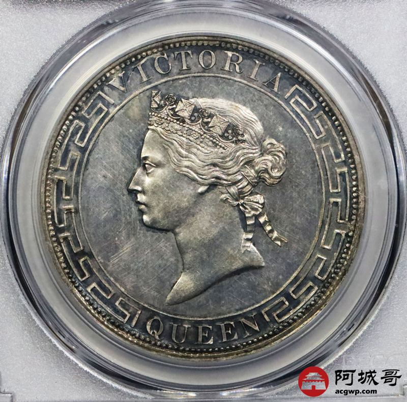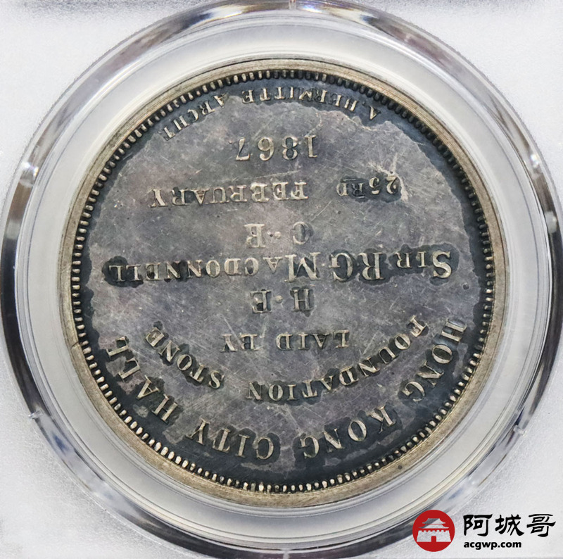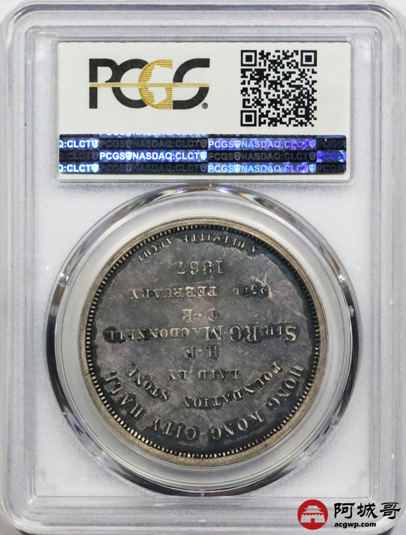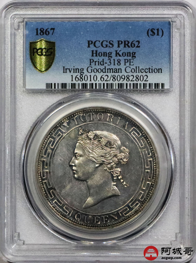 Lot:1489 1867年香港壹圆背港英政府大楼落成纪念银币一枚,镜面精制,‘古德曼旧藏’1995年拍卖原物,存世仅数枚 PCGS PR62评级编号:80982802