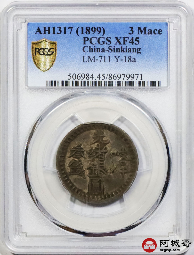 Lot:1448 AH1317(1899)年喀什造光绪银元叁钱银币一枚,北浦大介旧藏,原汁原味 PCGS XF45评级编号:86979971