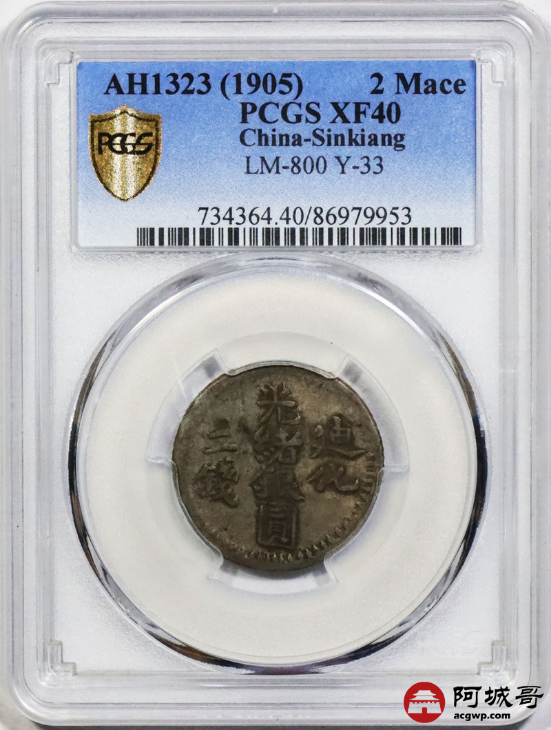 Lot:1455 AH1323(1905)年新疆迪化光绪银元贰钱银币一枚,北浦大介旧藏,原汁原味 PCGS XF40评级编号:86979953