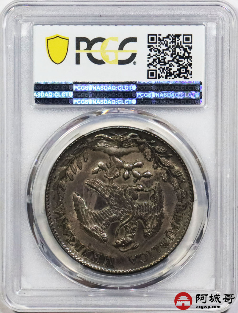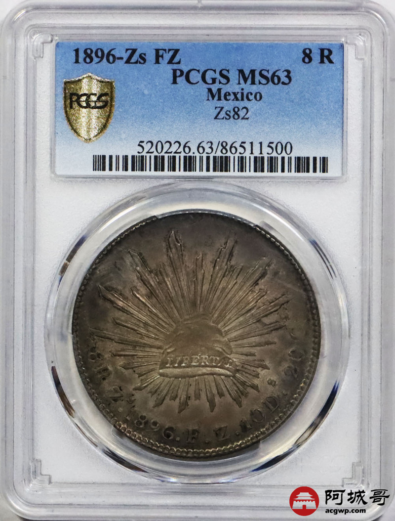 Lot:1478 1896年墨西哥鹰洋8瑞尔银币一枚,酱彩包浆 PCGS MS63评级编号:86511500