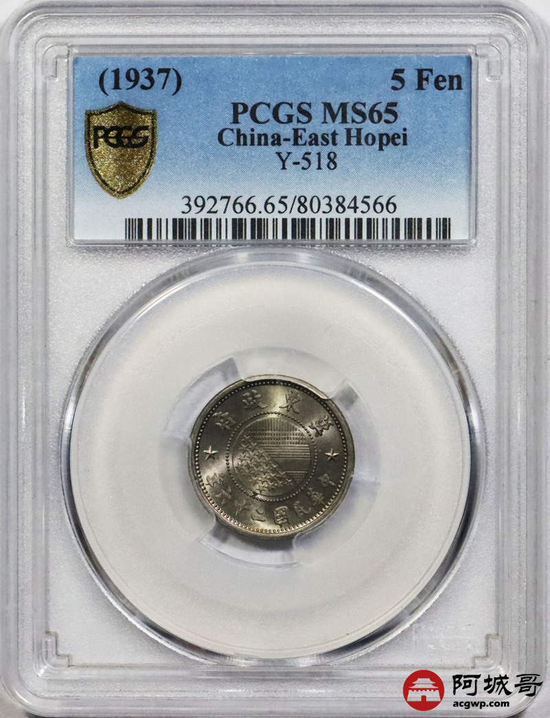 Lot:1559 1937民国二十六年伪冀东政府伍分镍币一枚 PCGS MS65评级编号:80384566