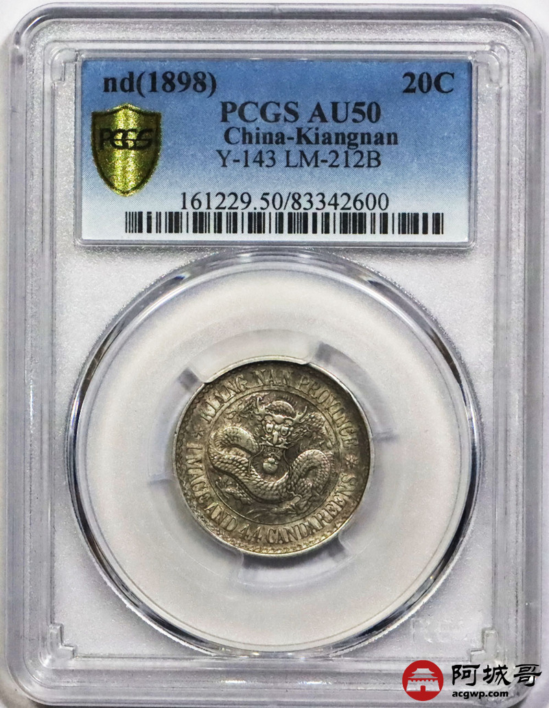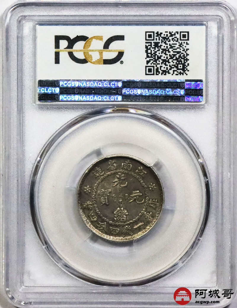 Lot:1351 1898年江南省造光绪元宝库平一钱四分四厘银币一枚,深打黄油彩浆 PCGS AU50评级编号:83342600