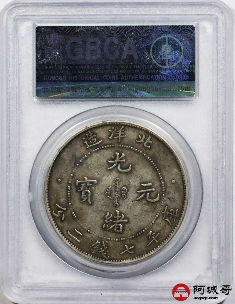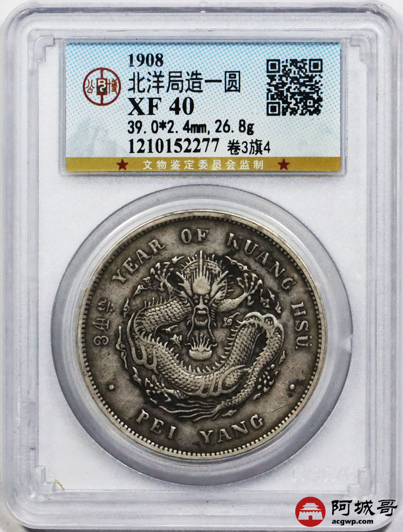 Lot:1746 1908光绪三十四年北洋造光绪元宝库平七钱二分银币一枚,卷三旗4缺云版,原味 公博评级 XF40评级编号:1210152277