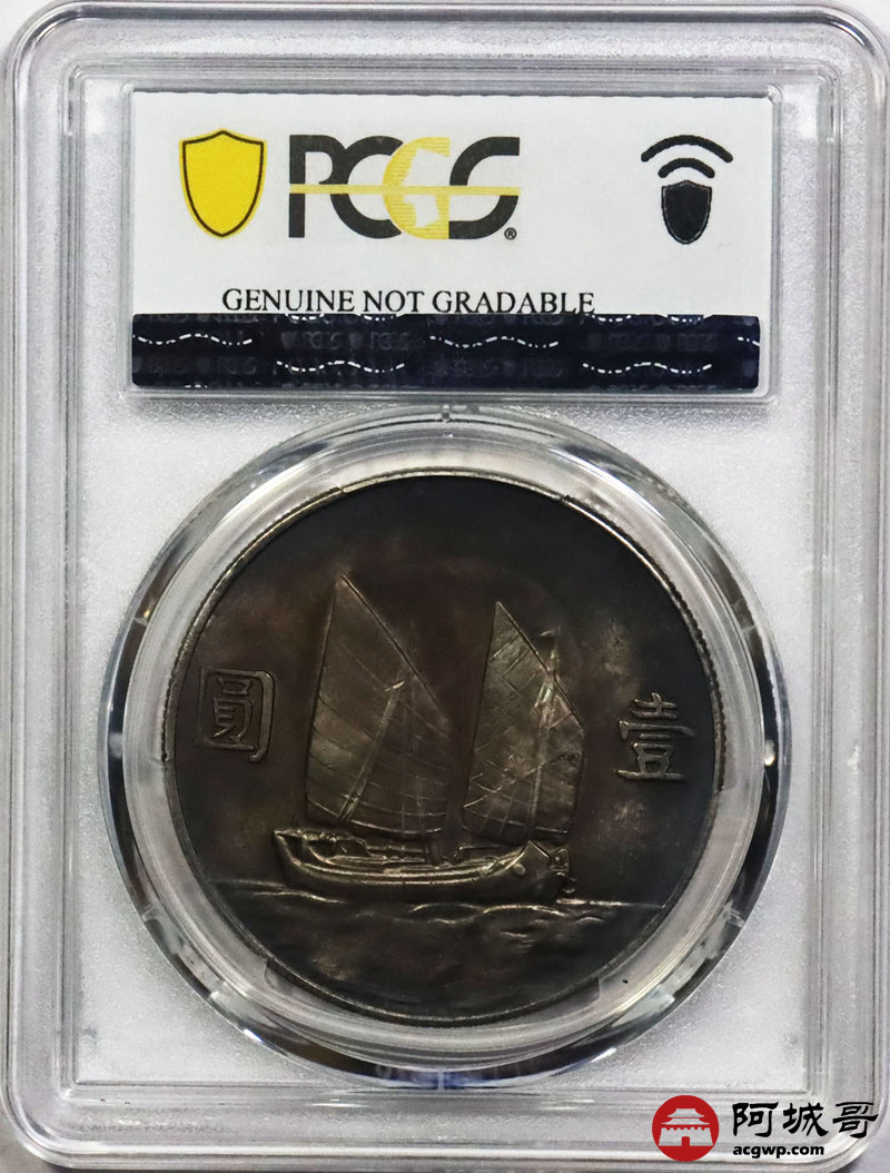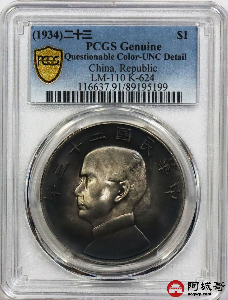 Lot:1838 1934民国二十三年孙中山像背帆船壹圆银币一枚,底板氧化黑彩 PCGS UNC 91评级编号:89195199