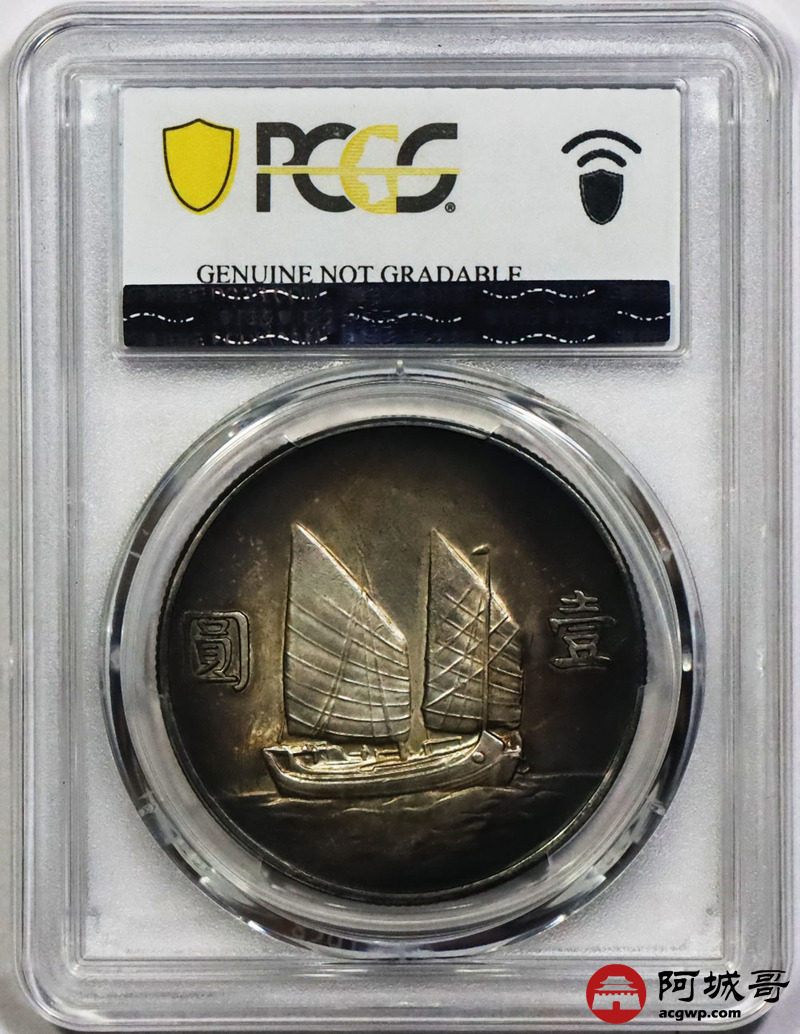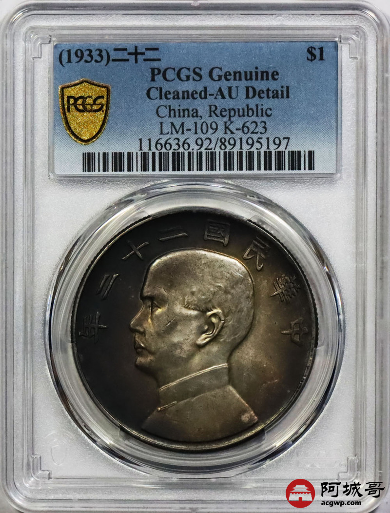 Lot:1482 1933民国二十二年孙中山像背帆船壹圆银币一枚,氧化环彩包浆 PCGS AU 92评级编号:89195197