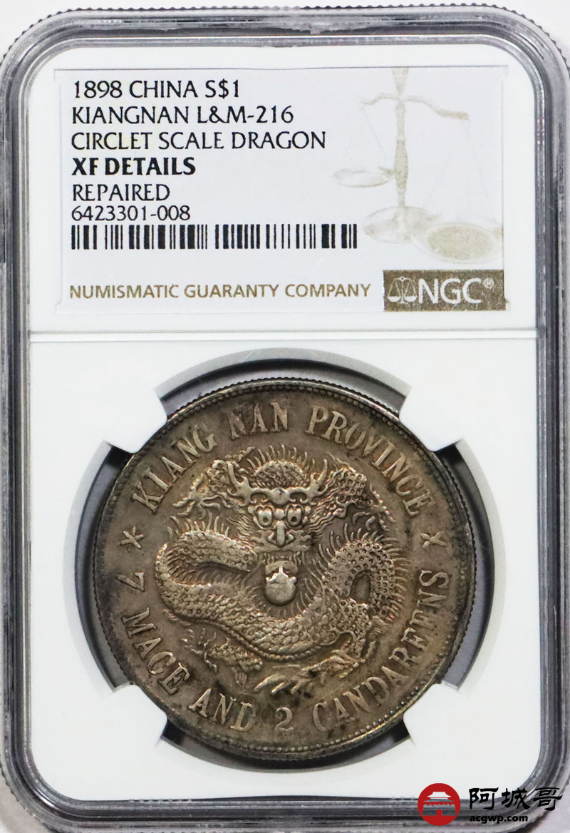 Lot:1348 1898戊戌年江南省造光绪元宝库平七钱二分银币一枚,珍珠龙,原味 NGC XF评级编号:6423301-008
