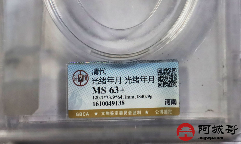 Lot:1527 清代-河南,光绪年月,光绪年月五十两银锭一枚,1840.9g GBCA MS63+评级编号:1610049138