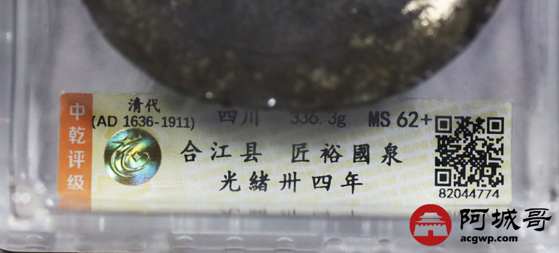 Lot:1531 清代-四川,光绪卅四年,合江县,匠裕国泉银锭一枚,336.3g 中乾评级 MS62+ 评级编号:82044774