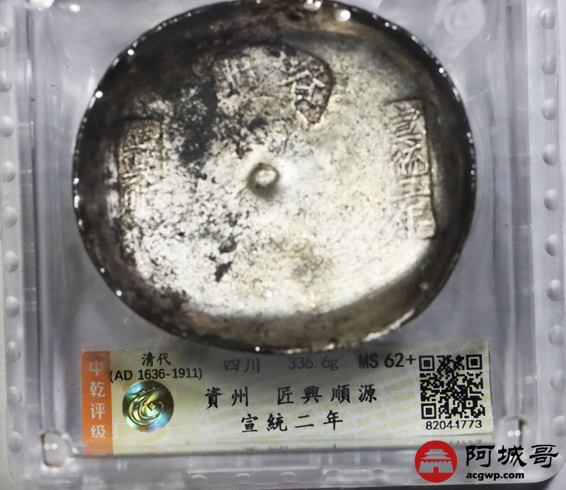 Lot:1533 清代-四川,宣统二年 ,资州,匠兴顺源银锭一枚,336.6g 中乾评级 MS62+评级编号:82044773