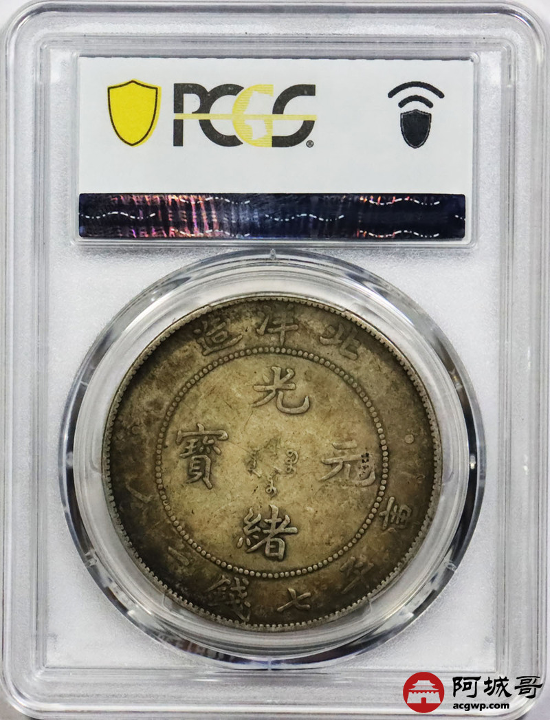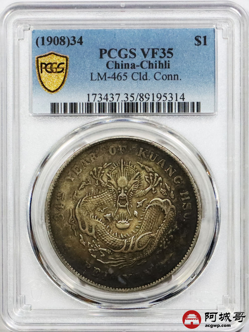 Lot:1751 1908光绪三十四年北洋造光绪元宝库平七钱二分银币一枚,老包浆 PCGS VF35评级编号:89195314