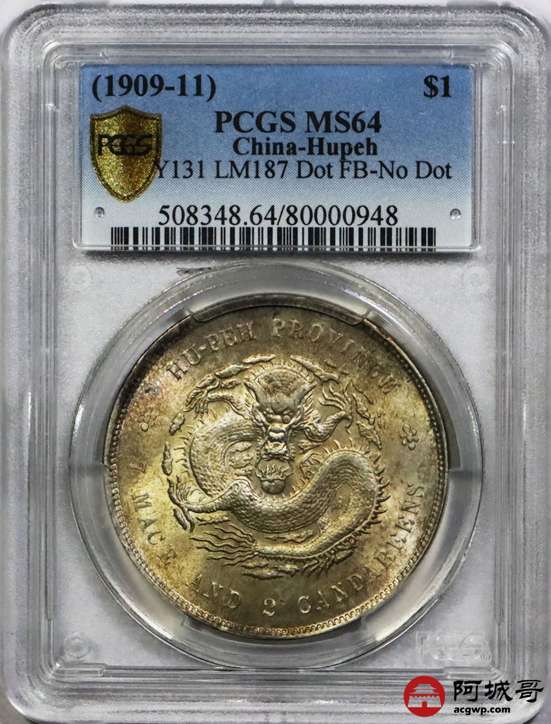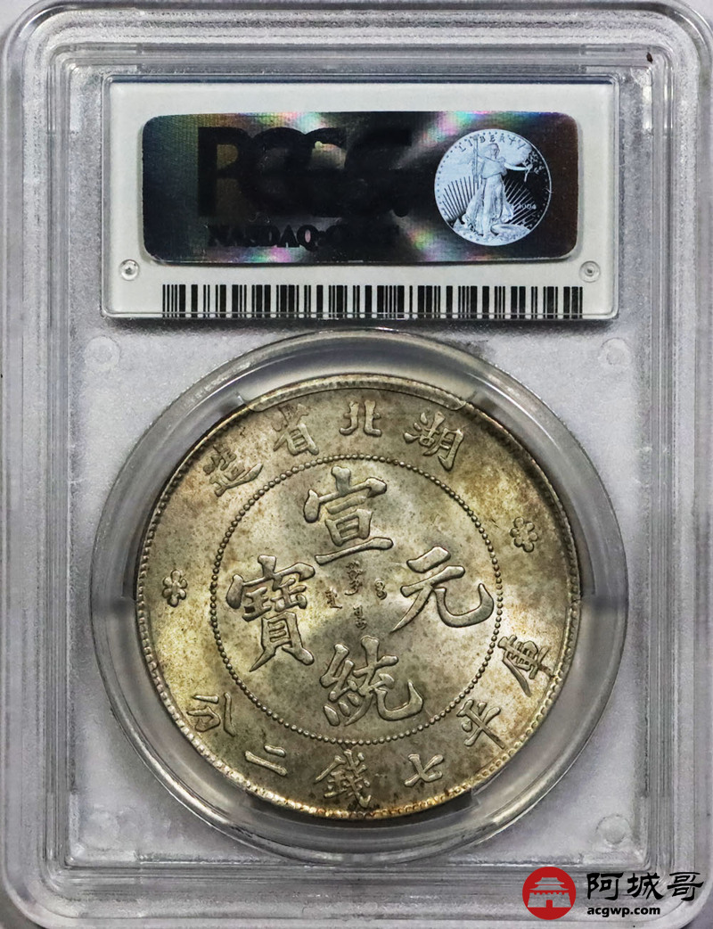 Lot:1319 1909-11年湖北省造宣统元宝库平七钱二分银币一枚,金彩黄油底板,光度极好 PCGS MS64评级编号:80000948
