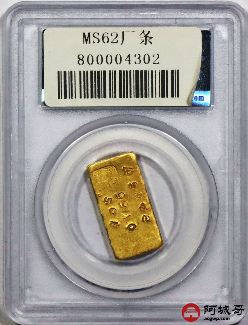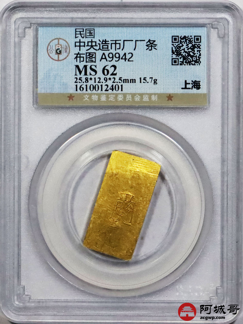 Lot:1519 民国时期上海中央造币厂徽布图半两金厂条一枚,15.7g 公博 MS62评级编号:1610012401