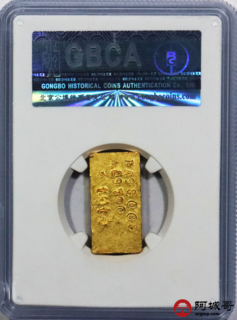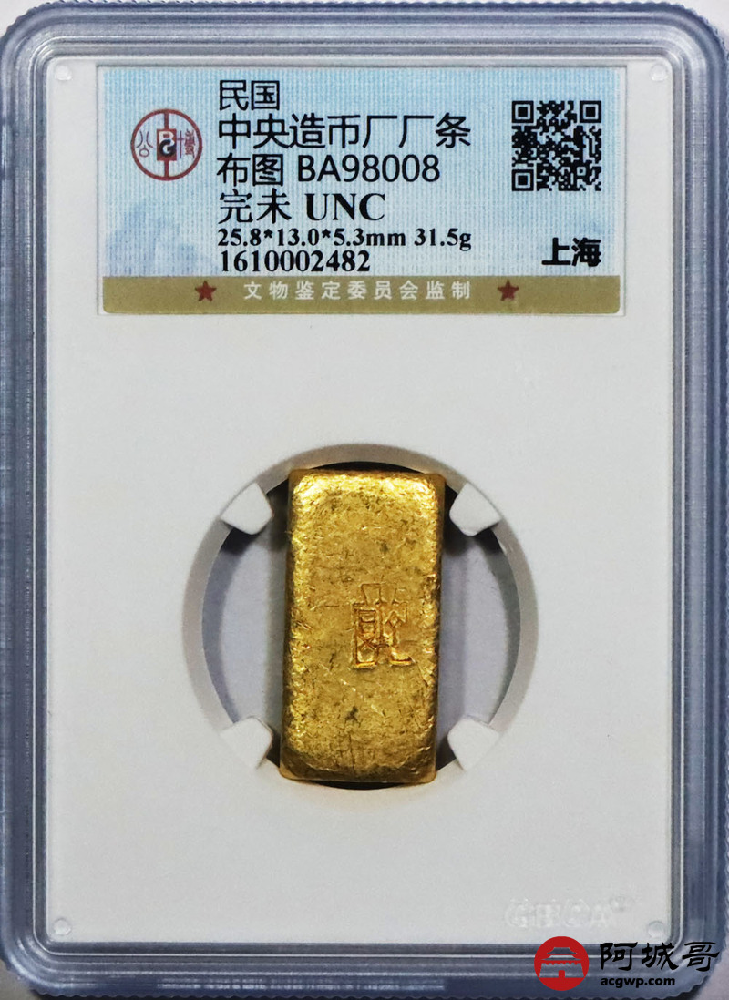 Lot:1507 民国时期上海中央造币厂徽布图一两金厂条一枚,31.5g 公博 UNC评级编号:1610002482
