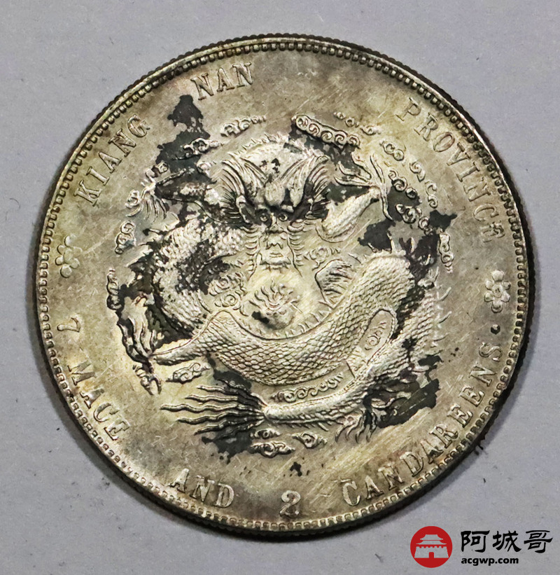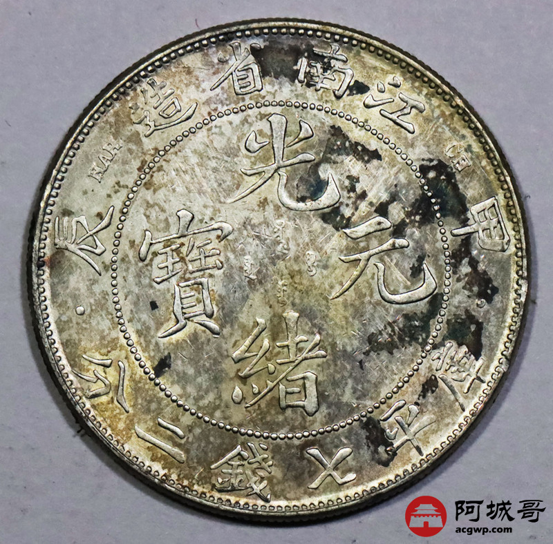 Lot:1797 1904甲辰年江南省造光绪元宝库平七钱二分银币一枚,彩光底板