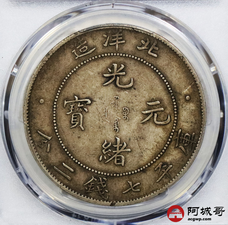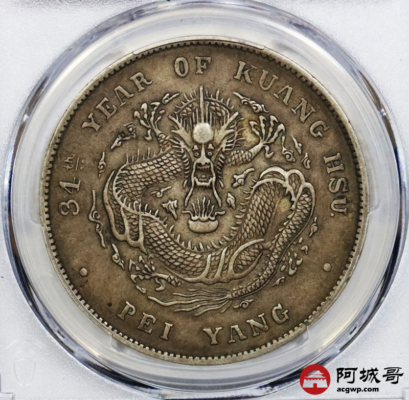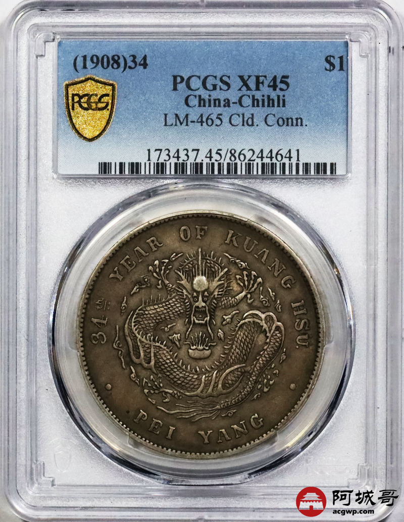 Lot:1762 1908北洋造光绪三十四年光绪元宝库平七钱二分银币一枚,原始包浆,均匀自然 PCGS XF45 评级编号:86244641