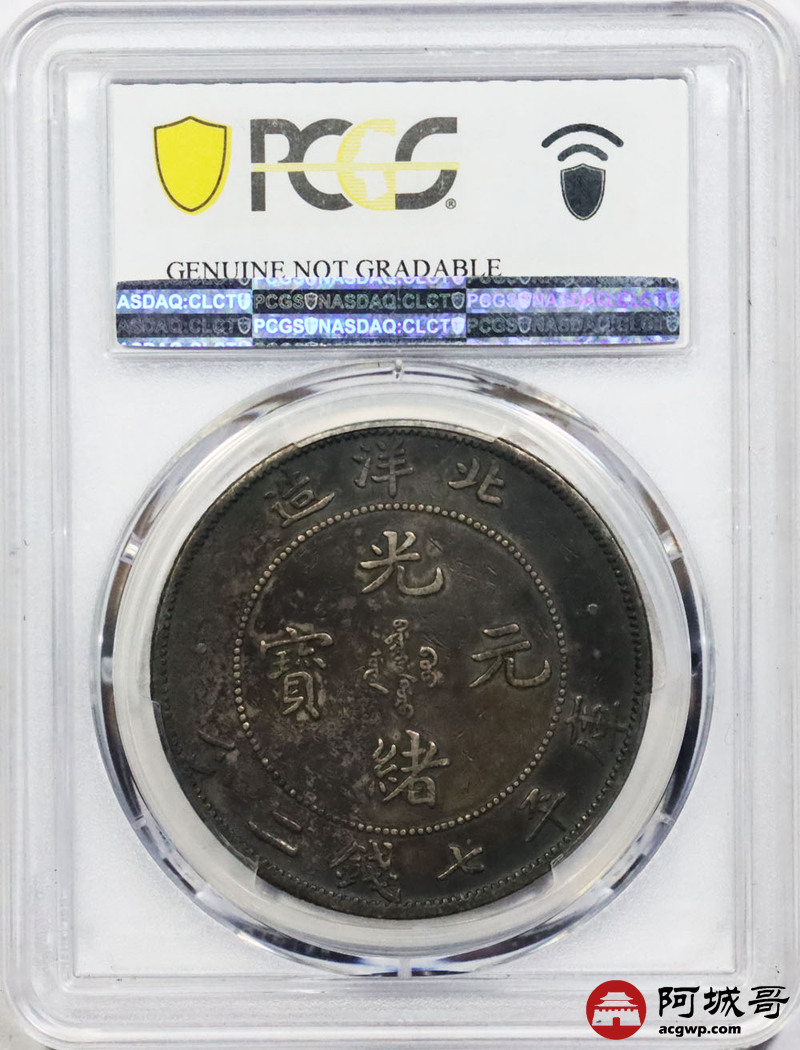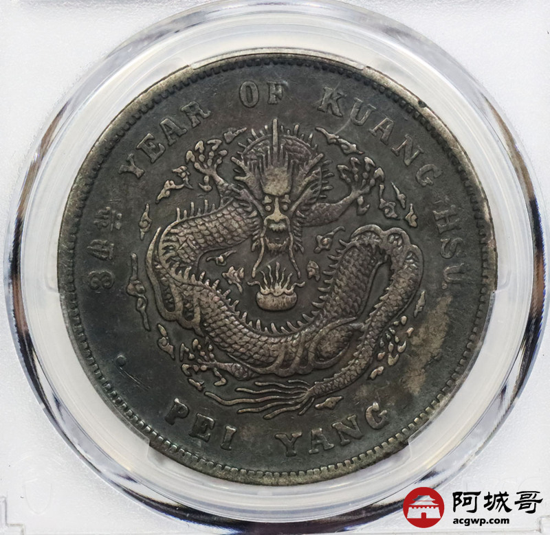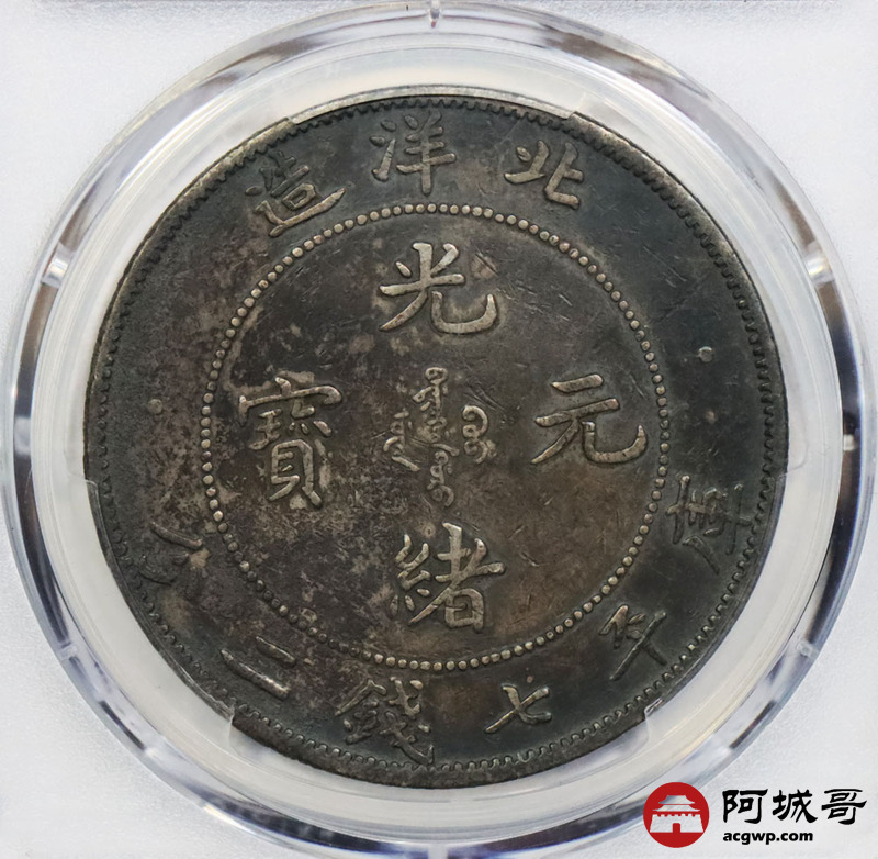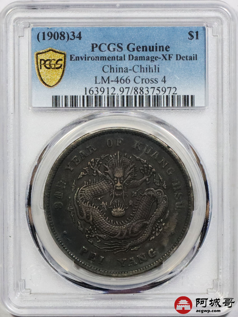 Lot:1763 1908北洋造光绪三十四年光绪元宝库平七钱二分银币一枚,卷三旗四,酱黑包浆PCGS XF97 评级编号:88375972