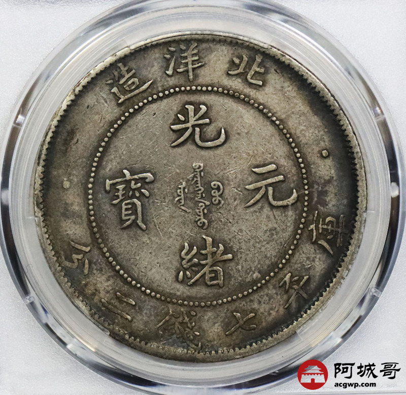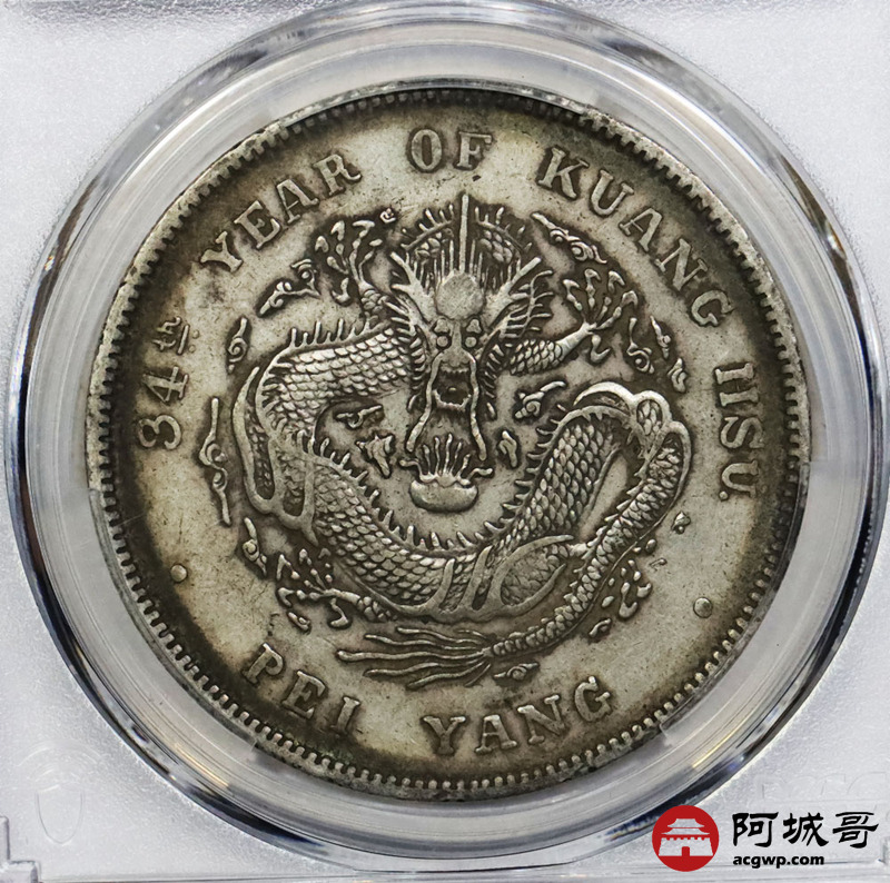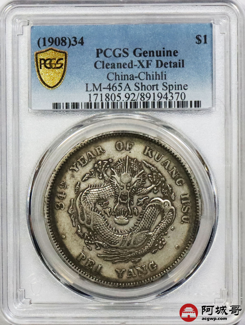 Lot:1665 1908光绪三十四年北洋造光绪元宝库平七钱二分银币一枚,短尾版,原味 PCGS XF92 评级编号:89194370