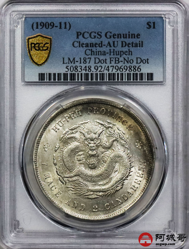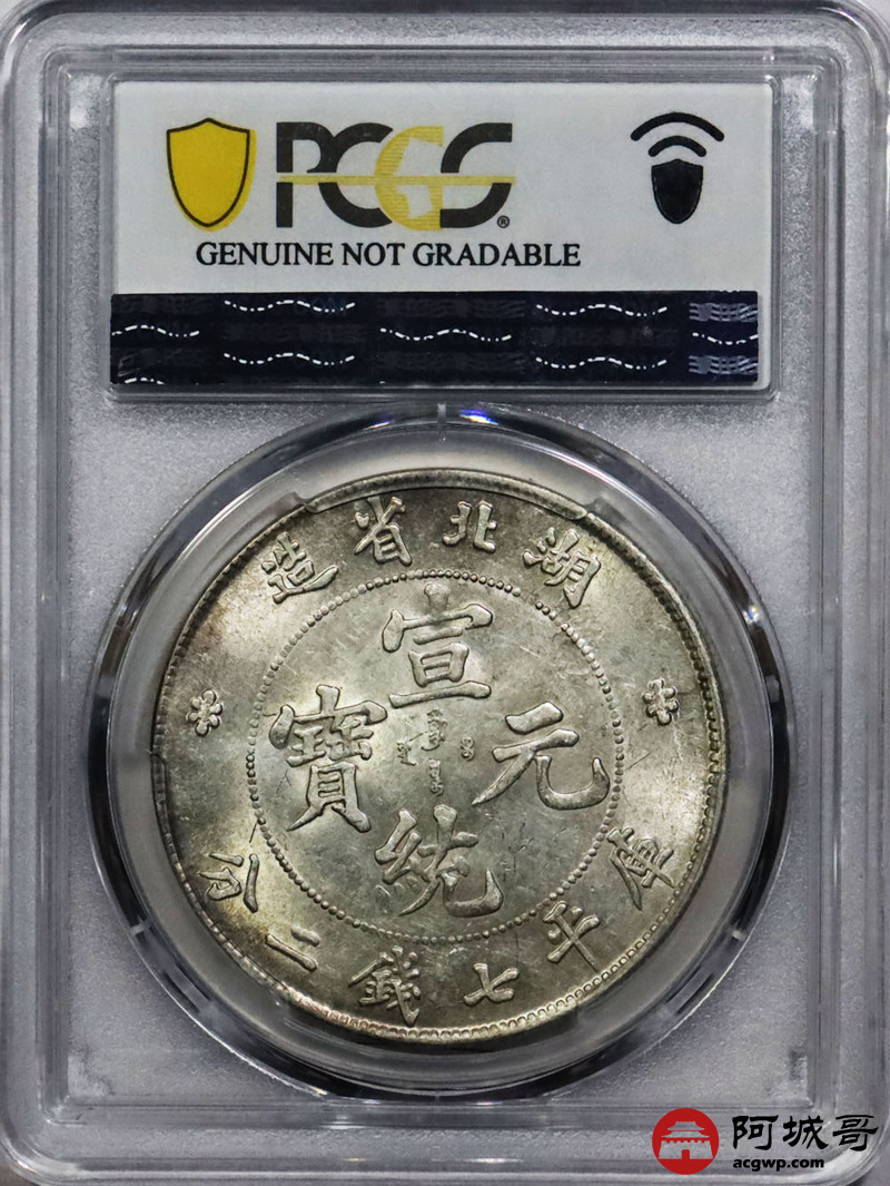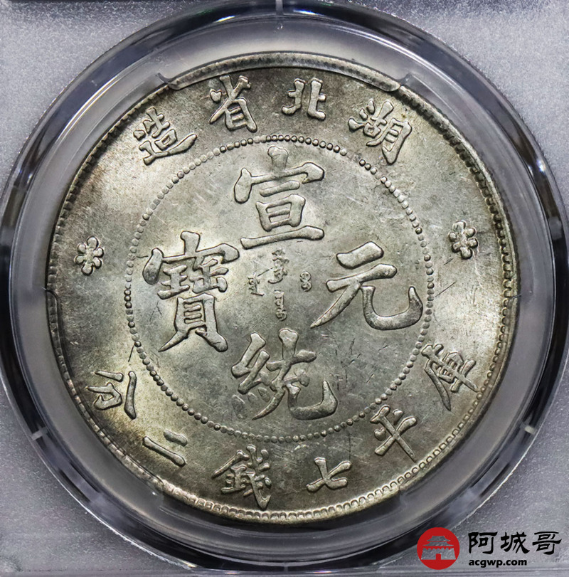 Lot:1338 1909-11年湖北省造宣统元宝库平七钱二分银币一枚,底光月牙彩 PCGS AU评级编号:47969886