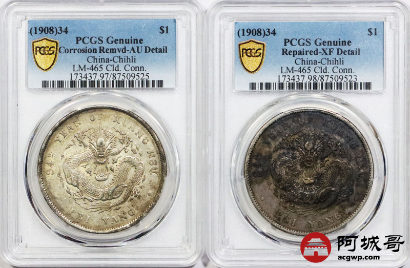 Lot:1748 1908年光绪三十四年北洋造光绪元宝库平七钱二分银币两枚 PCGS AU97评级编号:87509525 PCGS XF98评级编号:87509523