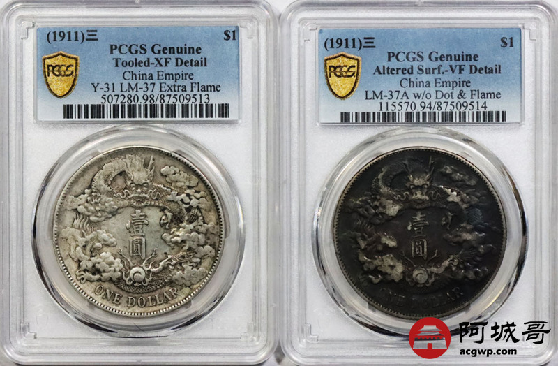 Lot:1828 1911年宣统三年大清银币壹圆银币两枚 PCGS XF98/PCGS VF94评级编号:87509513 评级编号:87509514