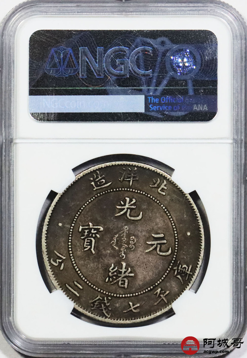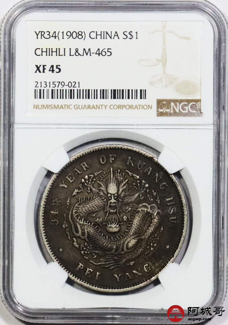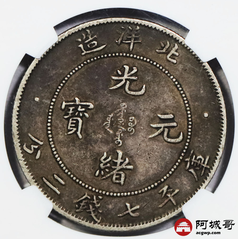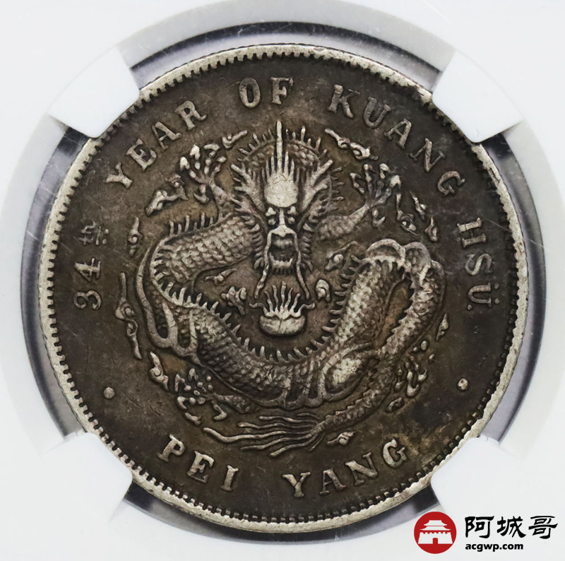 Lot:1769 1908北洋三十四年光绪元宝库平七钱二分银币一枚,传世酱彩包浆 NGC XF45 评级编号:2131579-021