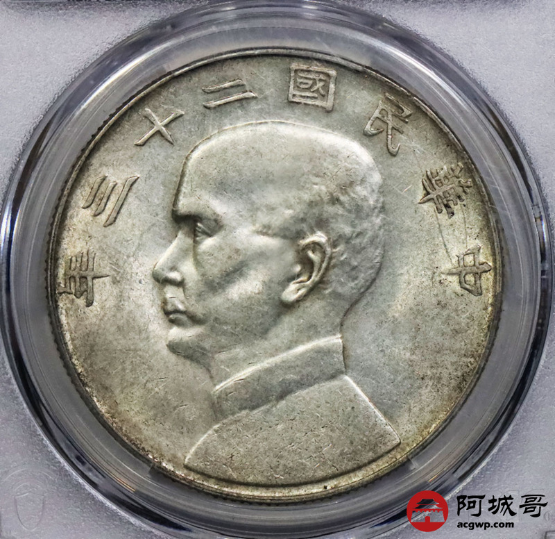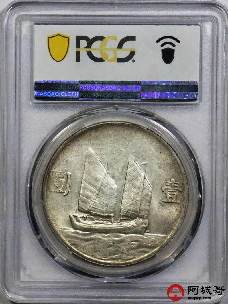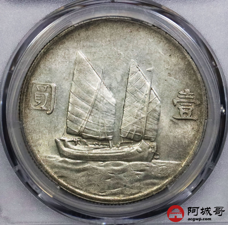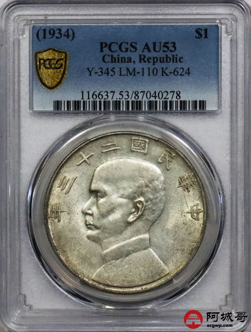 Lot:1834 1934民国二十三年孙中山像背帆船壹圆银币一枚,黄油底板 PCGS AU53评级编号:87040278