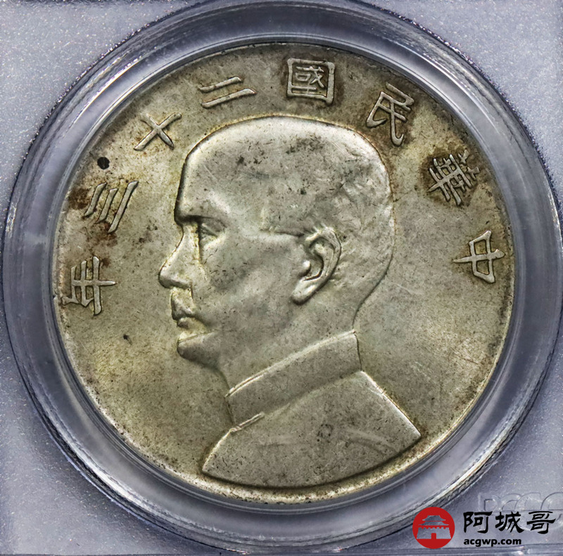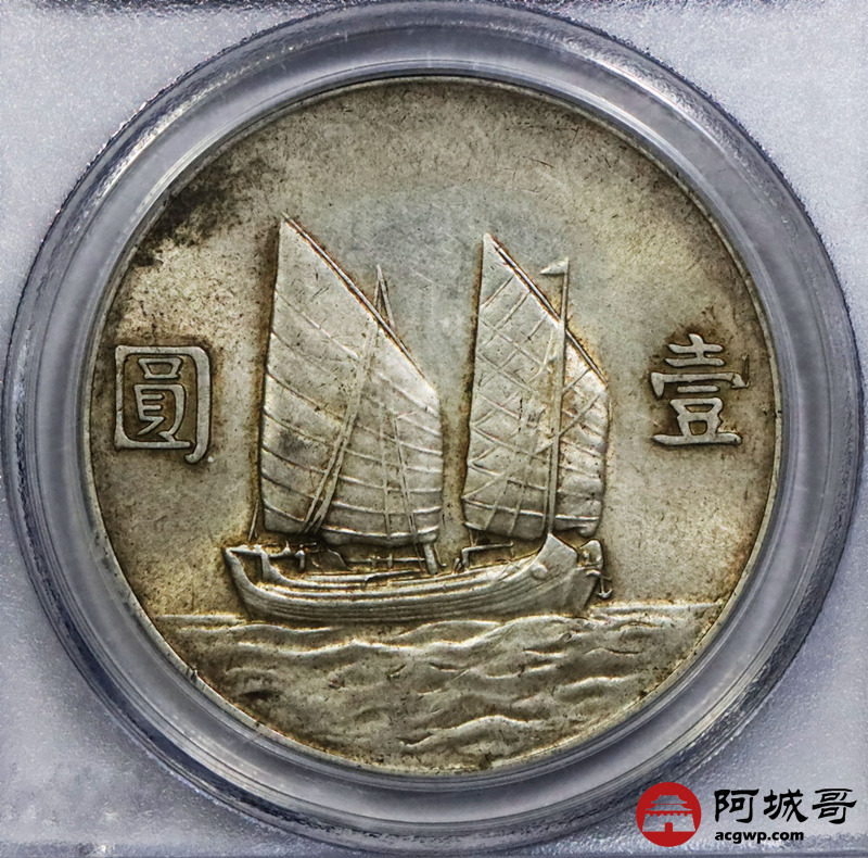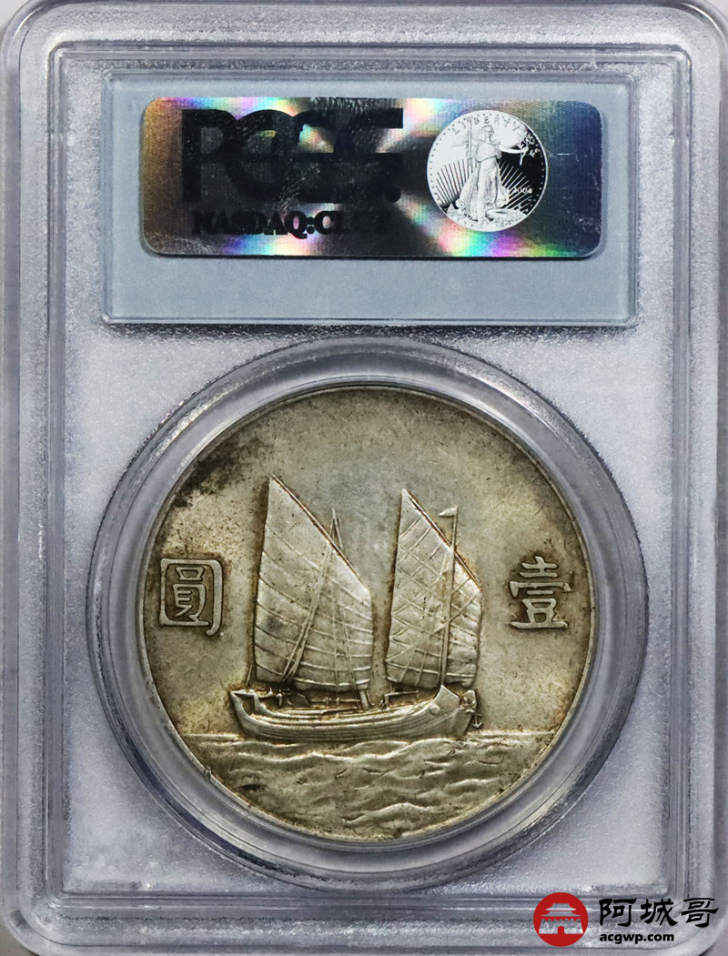 Lot:1837 1934民国二十三年孙中山像背帆船壹圆银币一枚,黄油底板 PCGS AU50评级编号:20310910