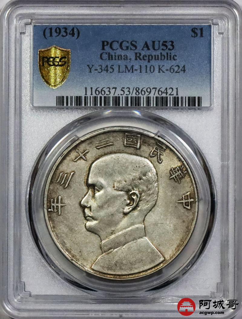Lot:1836 1934民国二十三年孙中山像背帆船壹圆银币一枚,原味 PCGS AU53评级编号:86976421