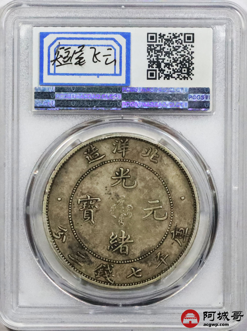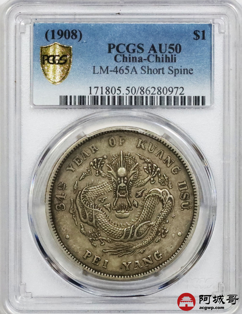 Lot:1578 1908三十四年北洋造光绪元宝库平七钱二分银币一枚,短尾飞云版,高额爆鳞,原味包浆 PCGS AU50 评级编号:86280972