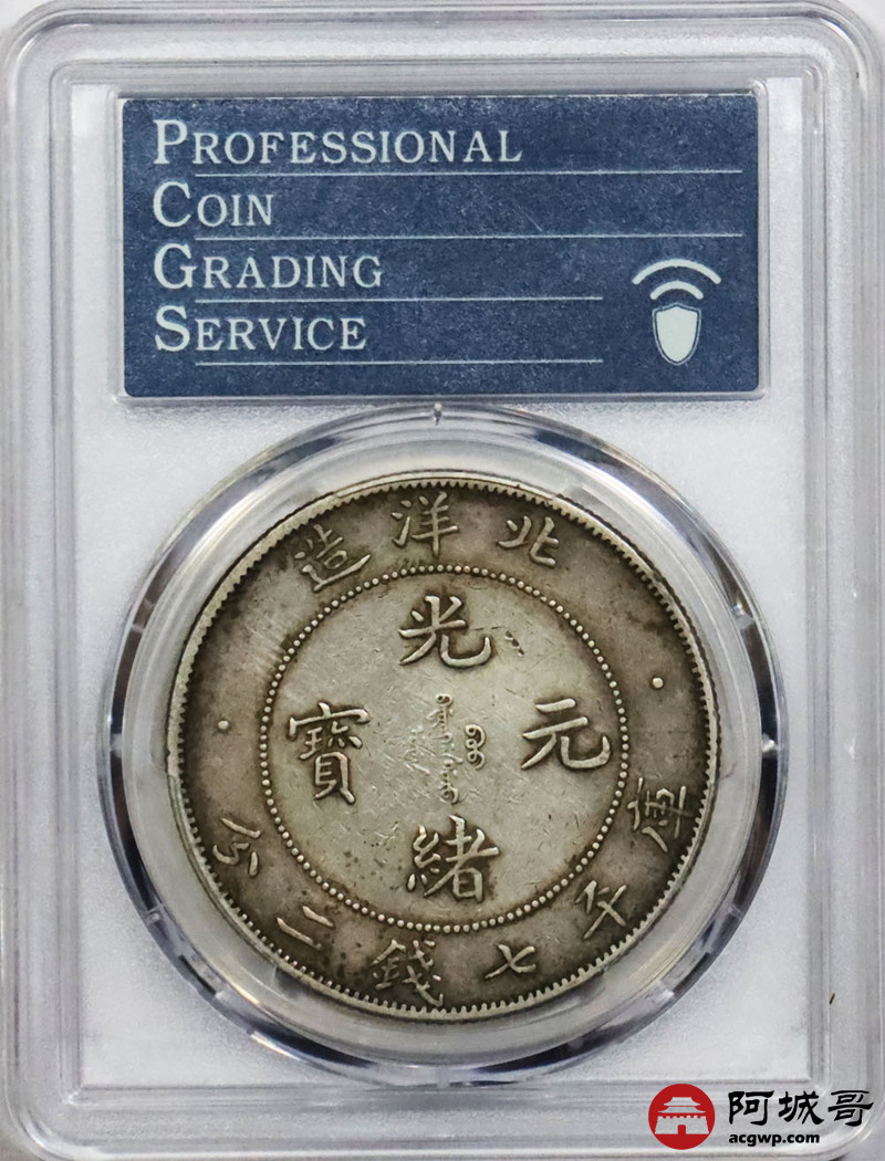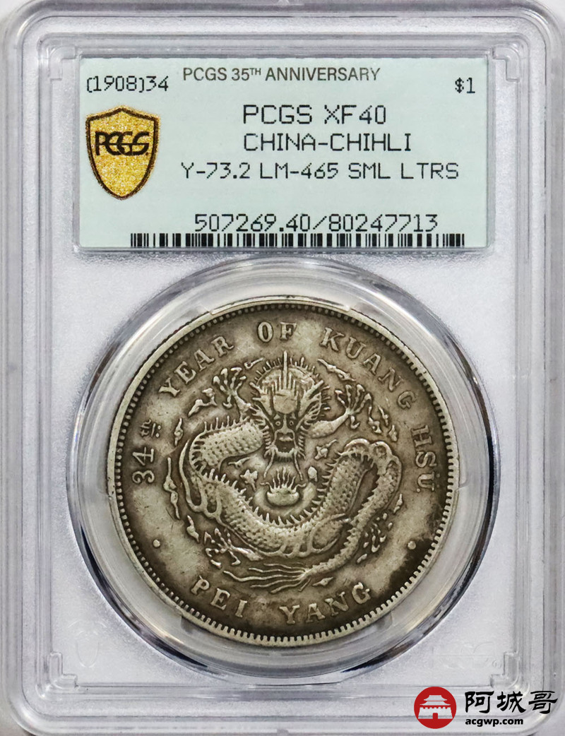 Lot:1719 1908三十四年北洋造光绪元宝库平七钱二分银币一枚,原味,小字卷三 PCGS XF40评级编号:80247713