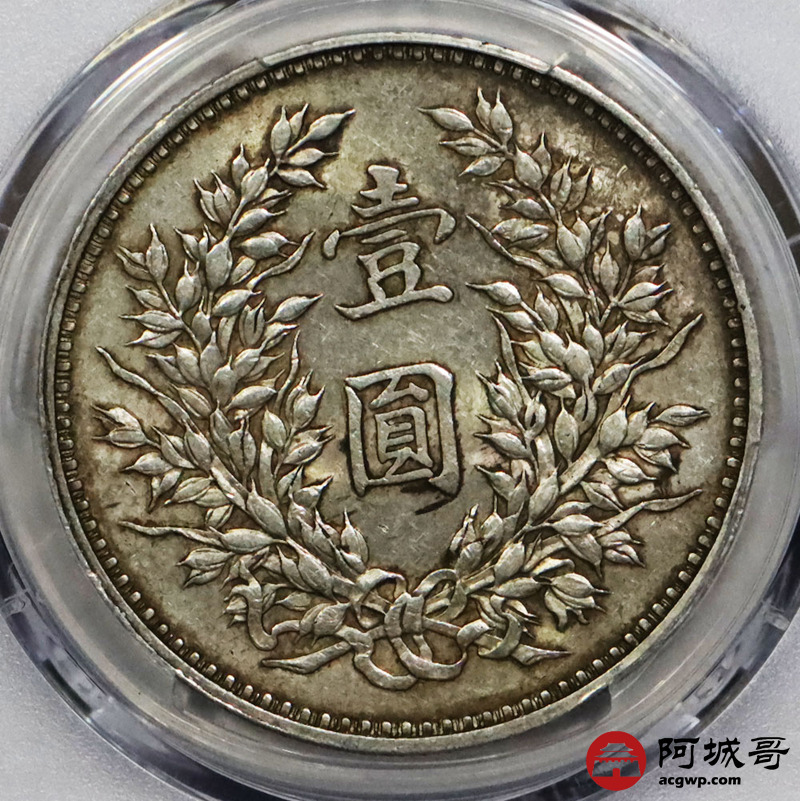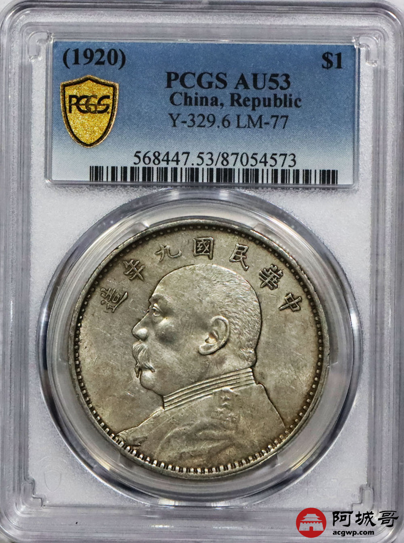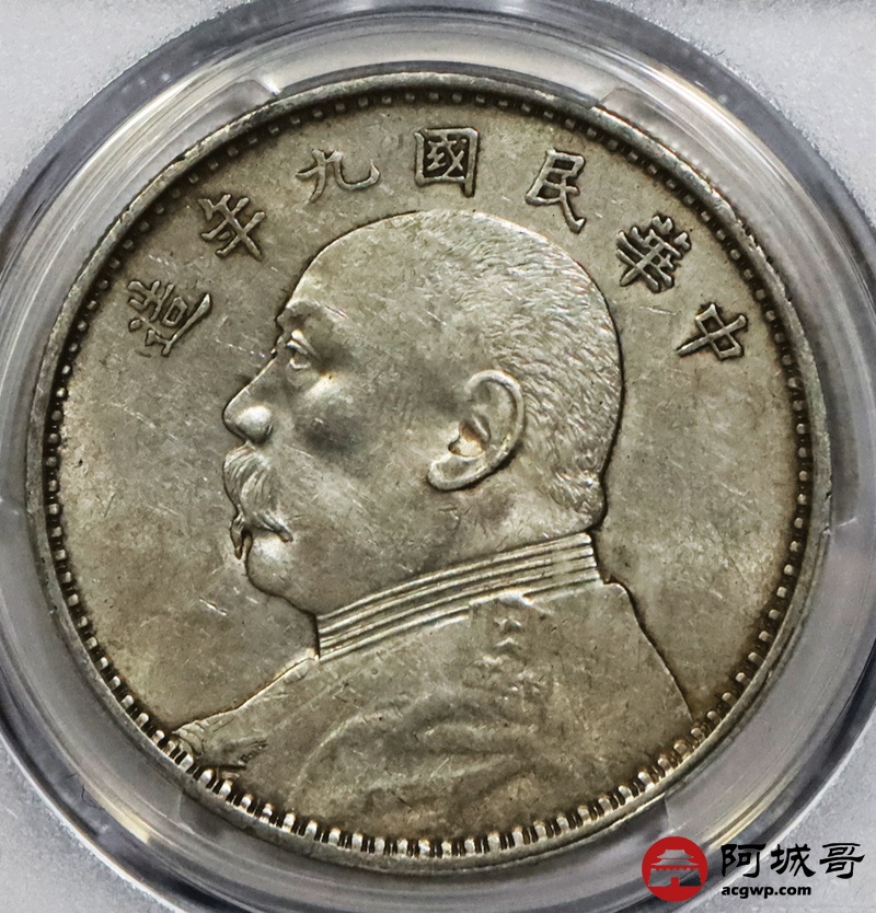 Lot:1859 1920民国九年袁世凯像壹圆银币一枚,精发版,黄油底板 PCGS AU53 评级编号:87054573