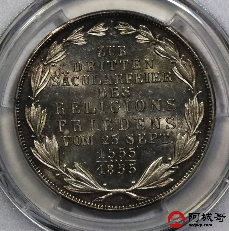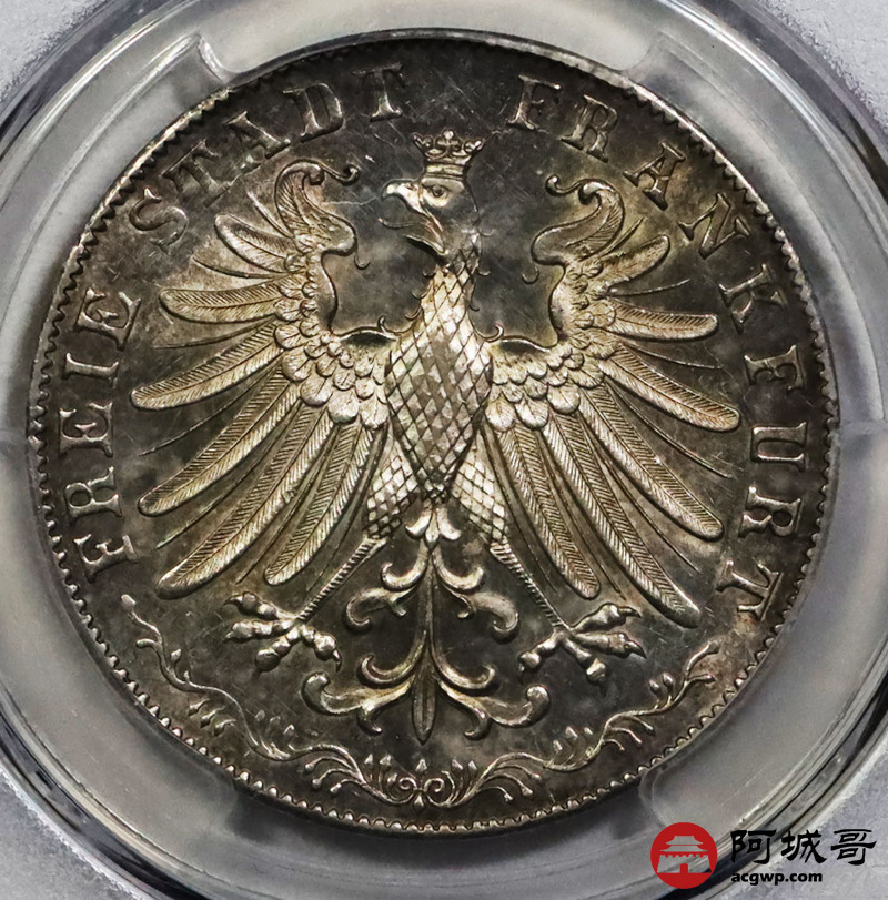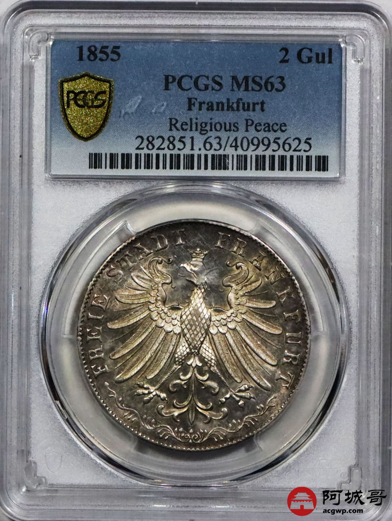 Lot:1562 1855年德国法兰克福银币一枚,镜面五彩底板 PCGS MS63 评级编号:40995625