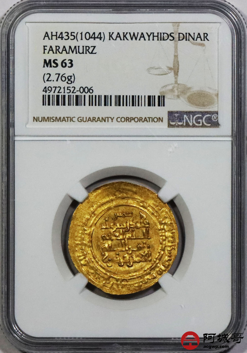 Lot:1391 公元11世纪丝路卡库伊德王朝第纳尔金币一枚 NGC MS63 评级编号:4972152-006