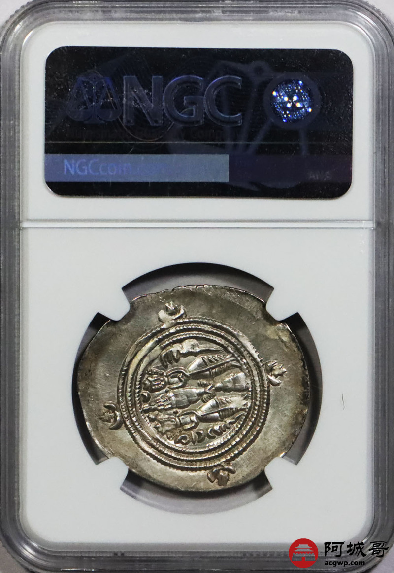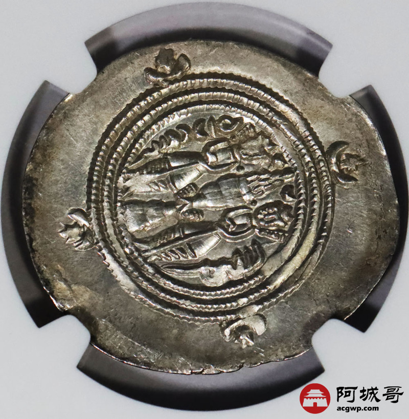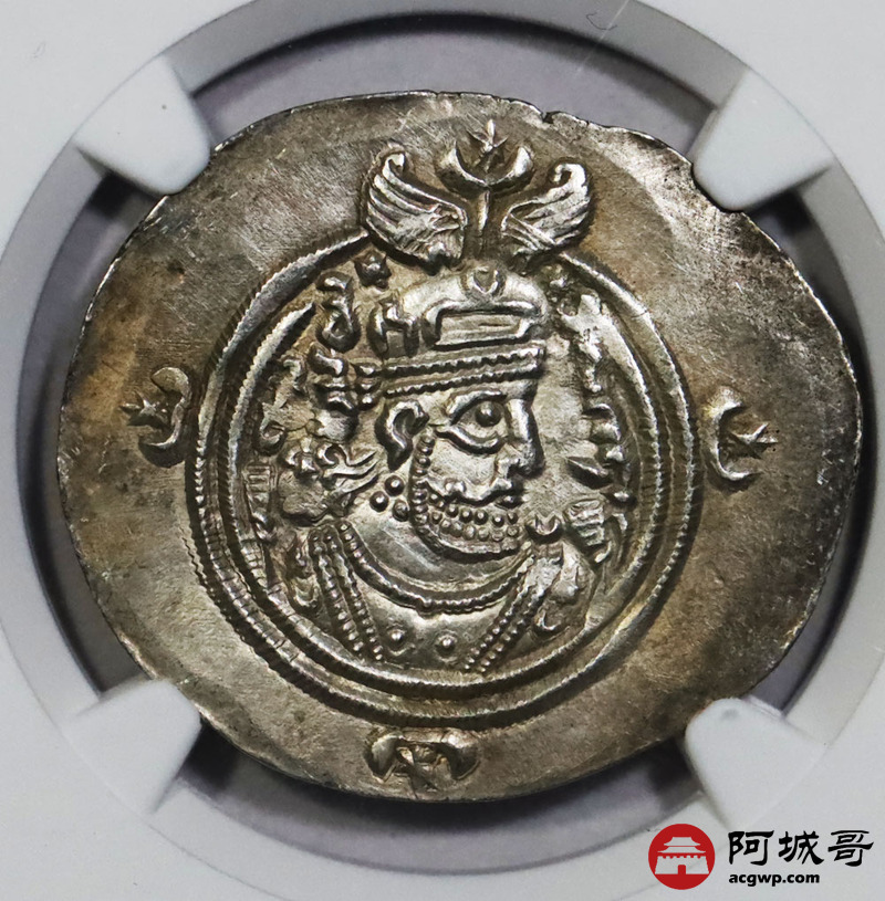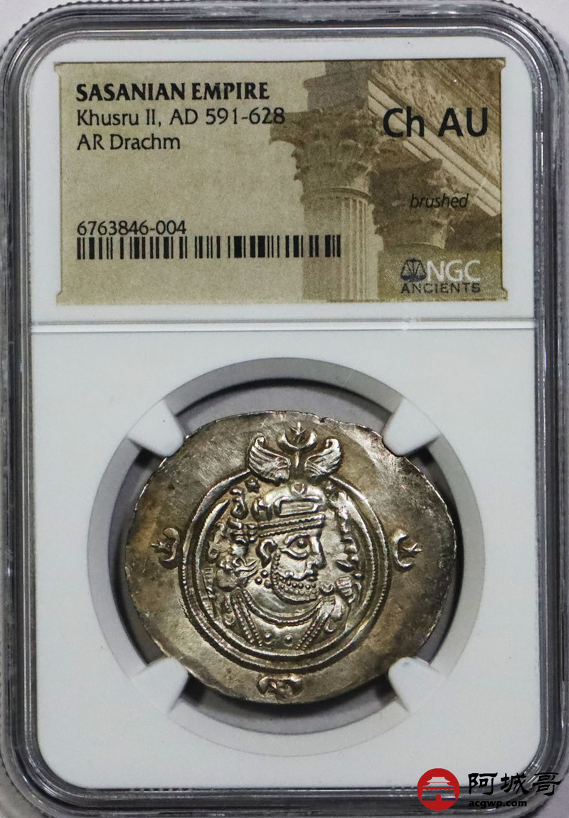 Lot:1395 公元前6世纪波斯萨珊帝国库斯瑙二世银币一枚 NGC CH AU 评级编号:6763846-004
