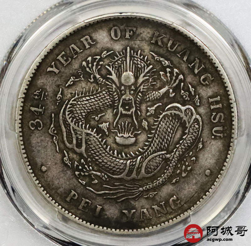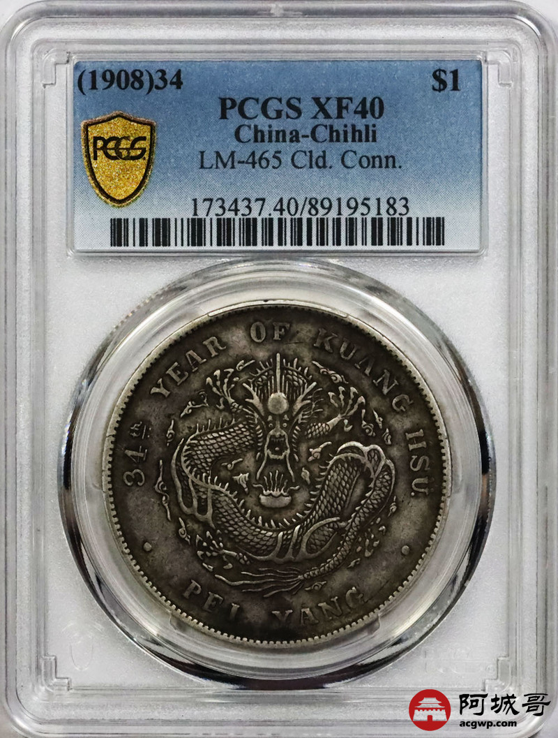 Lot:1605 1908光绪三十四年北洋造光绪元宝库平七钱二分银币一枚,原味 PCGS XF40 评级编号:89195183