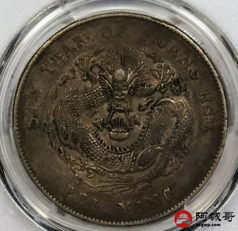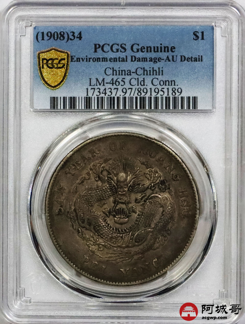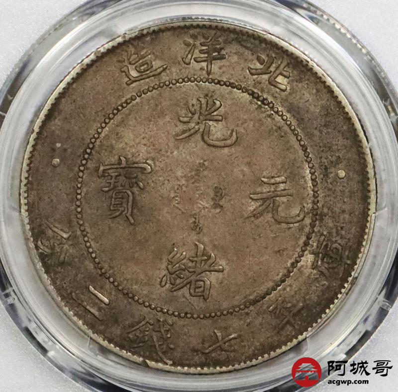 Lot:1609 1908光绪三十四年北洋造光绪元宝库平七钱二分银币一枚,原味 PCGS AU 评级编号:89195189