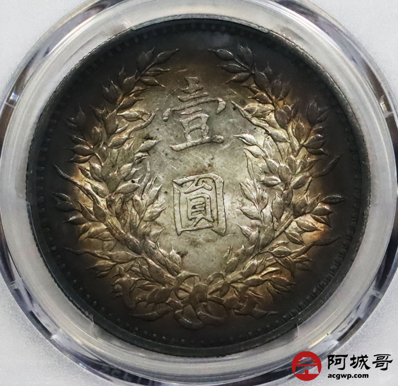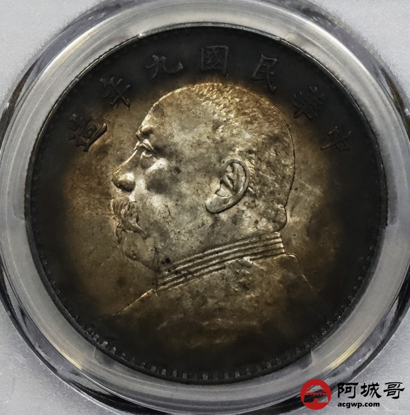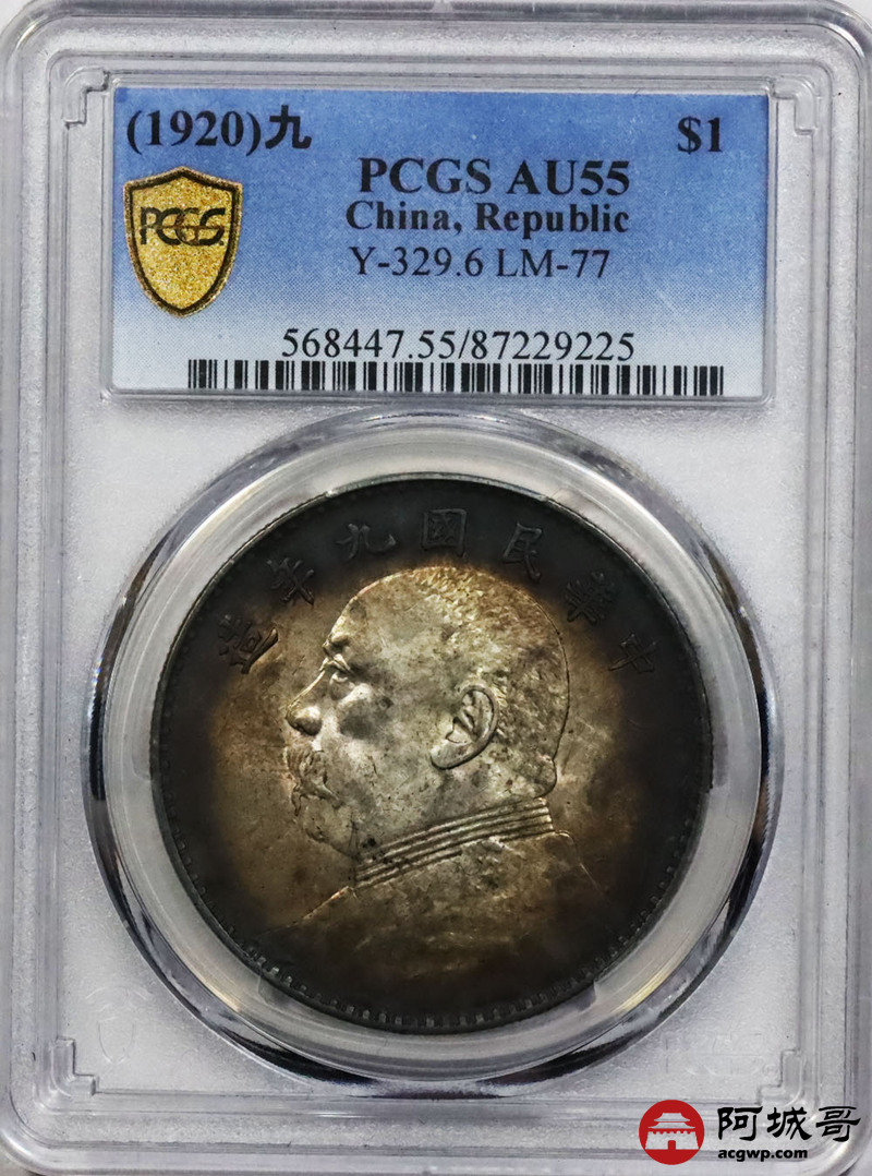 Lot:1861 1920民国九年袁世凯像壹圆银币一枚,氧化环状五彩包浆 PCGS AU55 评级编号:87229225