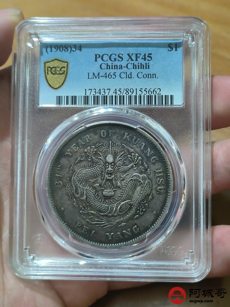 Lot:1708 1908光绪三十四年北洋造光绪元宝库平七钱二分银币一枚,老包浆PCGS XF45评级编号:89155662