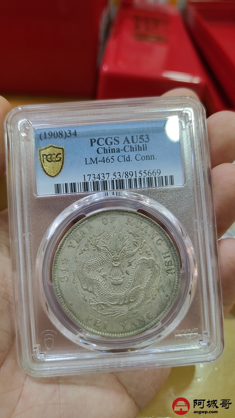 Lot:1659 1908光绪三十四年北洋造光绪元宝库平七钱二分银币一枚,黄油底板 PCGS AU53评级编号:89155669