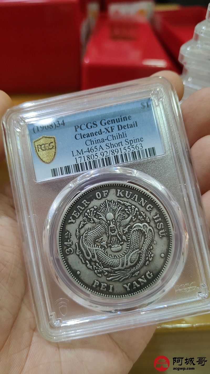 Lot:1648 1908光绪三十四年北洋造光绪元宝库平七钱二分银币一枚,短尾版,老包浆 PCGS XF92评级编号:89155563