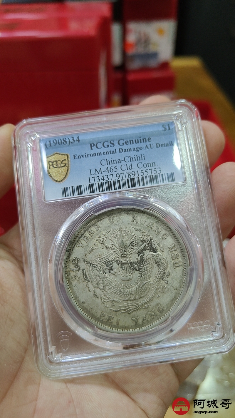 Lot:1582 1908光绪三十四年北洋造光绪元宝库平七钱二分银币一枚,原味 PCGS AU97评级编号:89155753