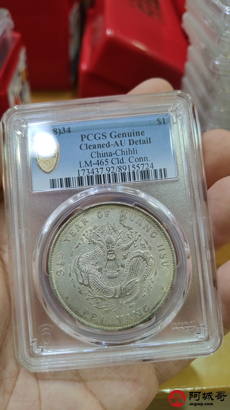 Lot:1725 1908光绪三十四年北洋造光绪元宝库平七钱二分银币一枚,黄油底板 PCGS AU92评级编号:89155724