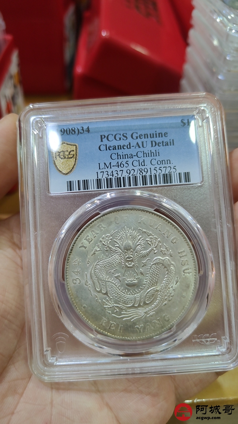 Lot:1731 1908光绪三十四年北洋造光绪元宝库平七钱二分银币一枚,高额头,爆龙鳞 PCGS AU92评级编号:89155725