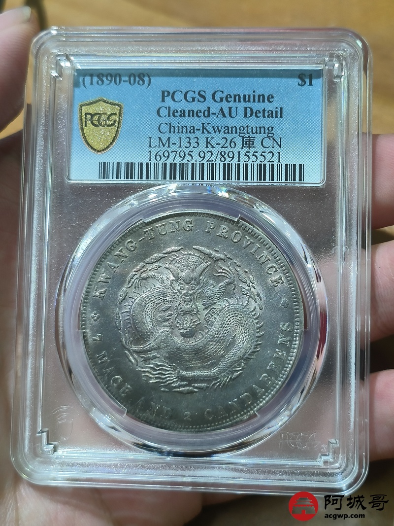 Lot:1310 1890-08年广东省造光绪元宝库平七钱二分银币一枚,字口深打,底板带光 PCGS AU92评级编号:89155521