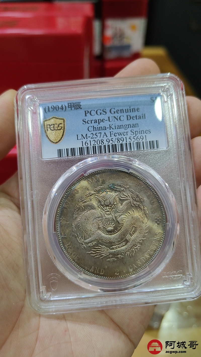 Lot:1377 1904甲辰年江南省造光绪元宝库平七钱二分银币一枚,彩光底板,未使用 PCGS UNC95评级编号:89155691